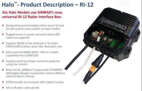 Many users may never see the Halo's RI-12 interface box, but they may appreciate its engineering. It can use either 12 or 24 volt power (just 6.5W in Instant On standby mode), which it then converts to 36v so that the cable to the actual radar is only that relatively thin white one. Halo also has quick and accurate antenna parking which can be locked down with very low current (10 milliamps, I'm told). In January the Simrad team thought that the radar's "safe distance" would be just a few feet, but recent testing proved it's "radiation safe to people within the swing circle of the array on all models."