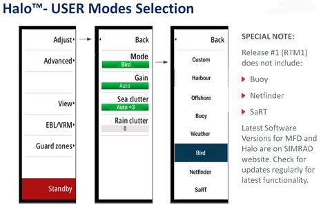 Simrad also spent a lot of time on making Halo easy to use, and they're still working on it. While there is a Custom mode in which you can tweak most any parameter, the slide above shows four (somewhat adjustable) automatic modes and three more coming in the first software update. The SaRT mode is especially interesting as one con of the 3G/4G solid-state radars is that they can't see RACONS and radar SARTs properly. Simrad says they've figured out a way, but don't expect it to meet IMO requirements. Incidentally, Halo rotation speed can vary up to 48 rpm, and the Bird mode takes it down to 16 in order to "maximize energy on target."